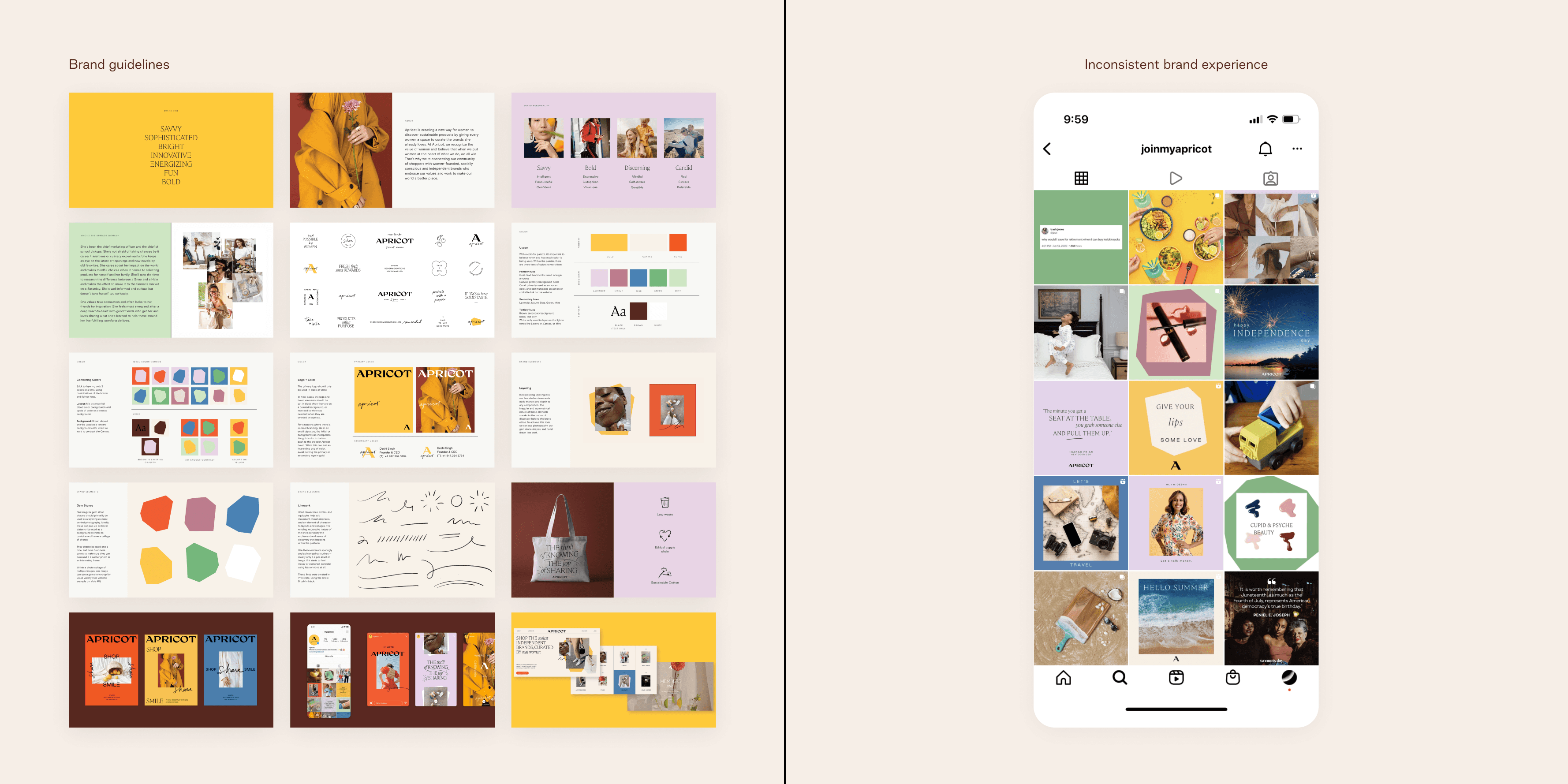 A visual audit revealed inconsistencies between brand guidelines and social media execution, creating a disconnected brand experience. The challenge was establishing a cohesive visual strategy that balanced inspirational content with product storytelling while staying true to Apricot's bold, whimsical brand identity—all within startup constraints.