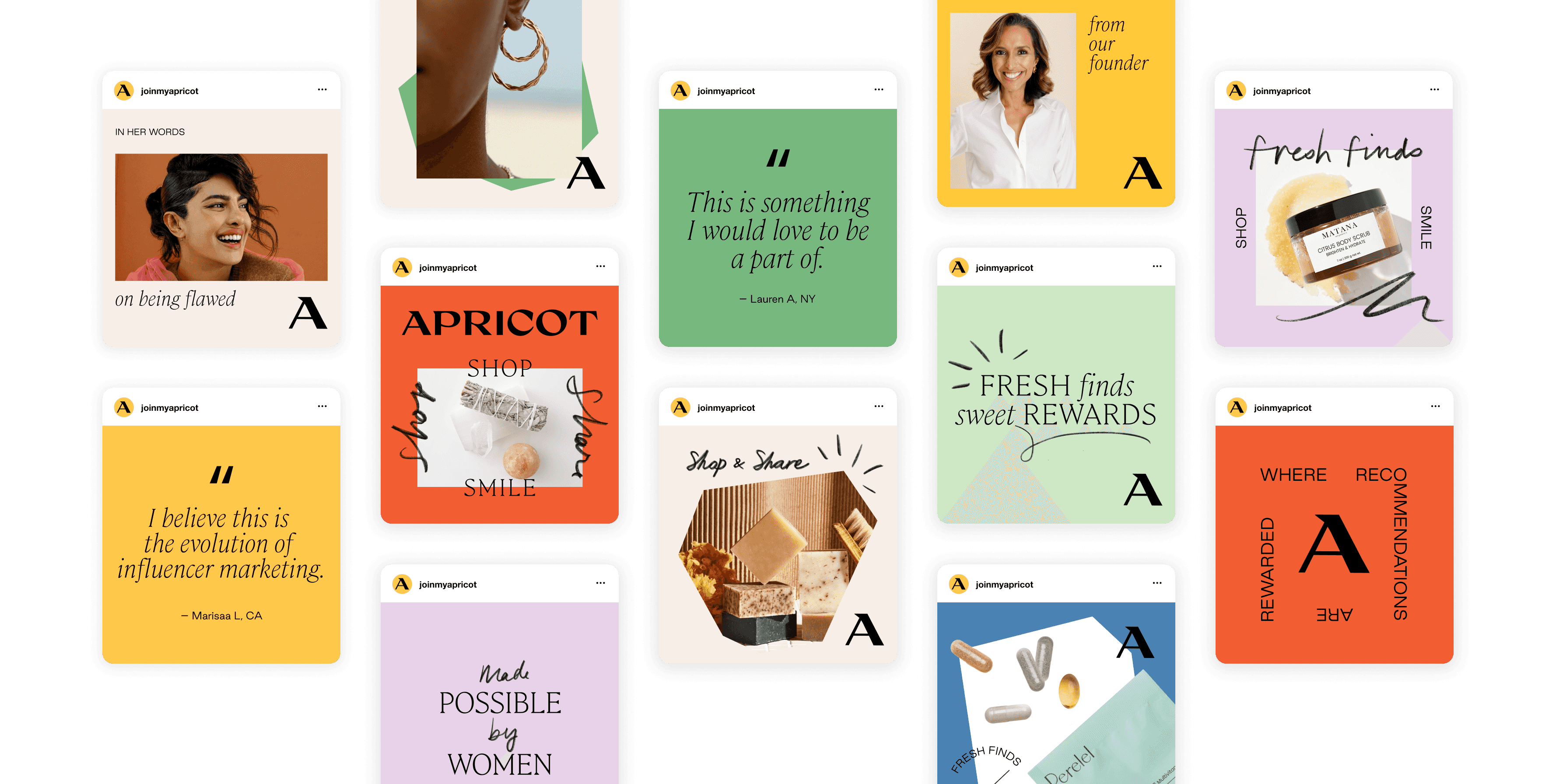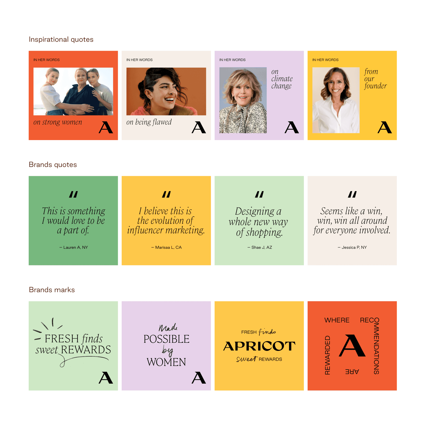 "In Her Words" Series: Features community voices paired with the Apricot "A" logo, creating authentic connection through personal perspectives.