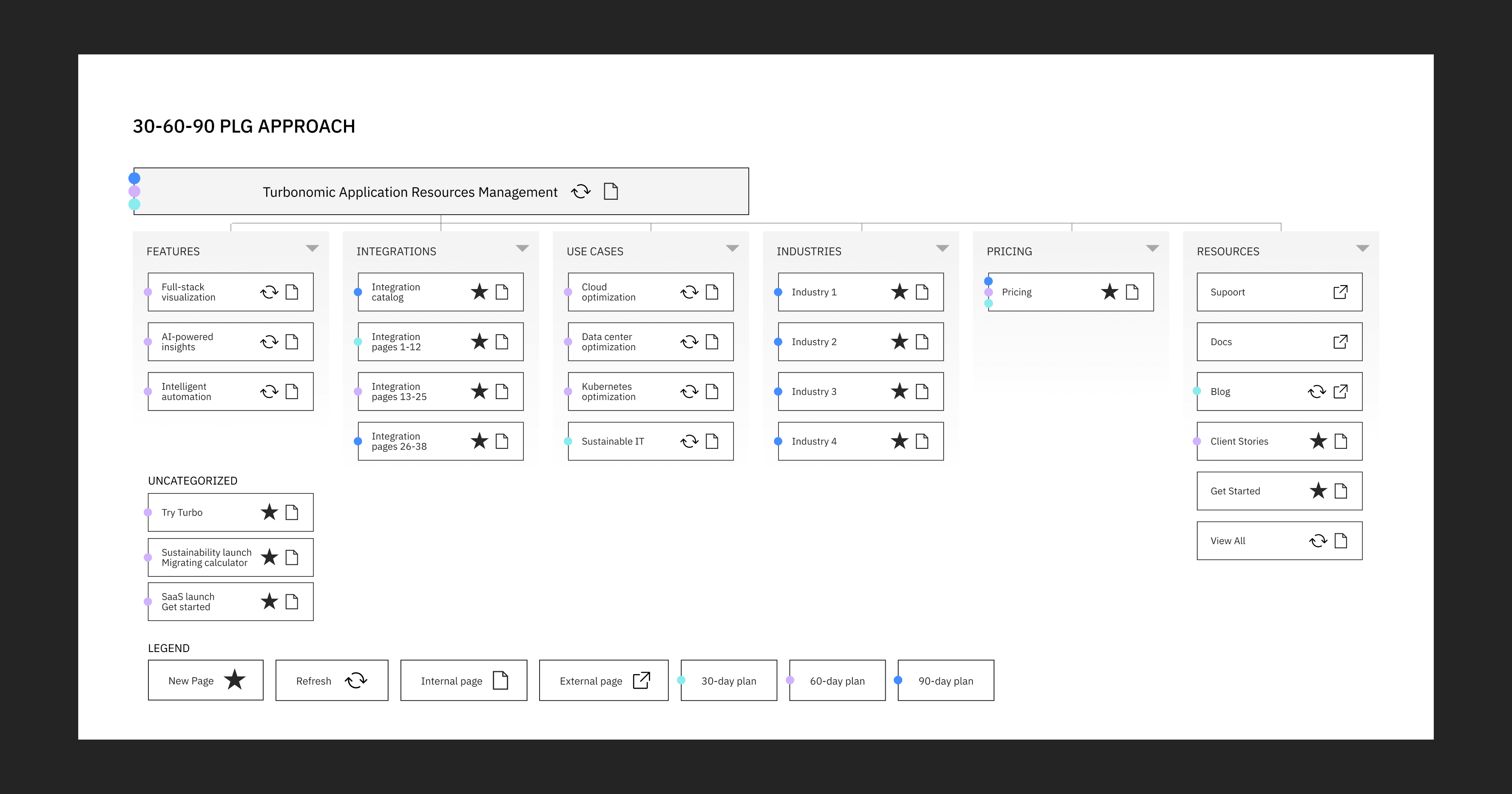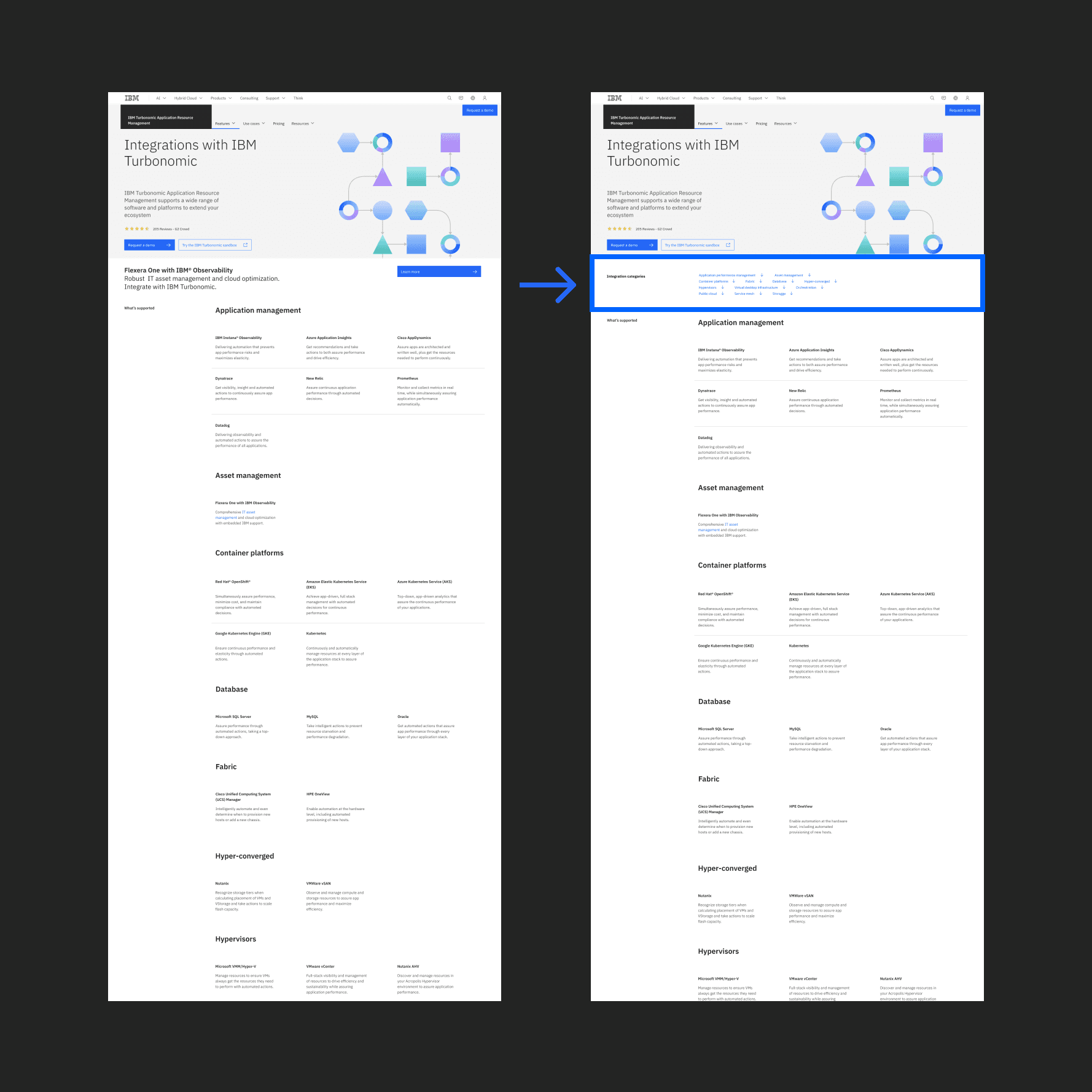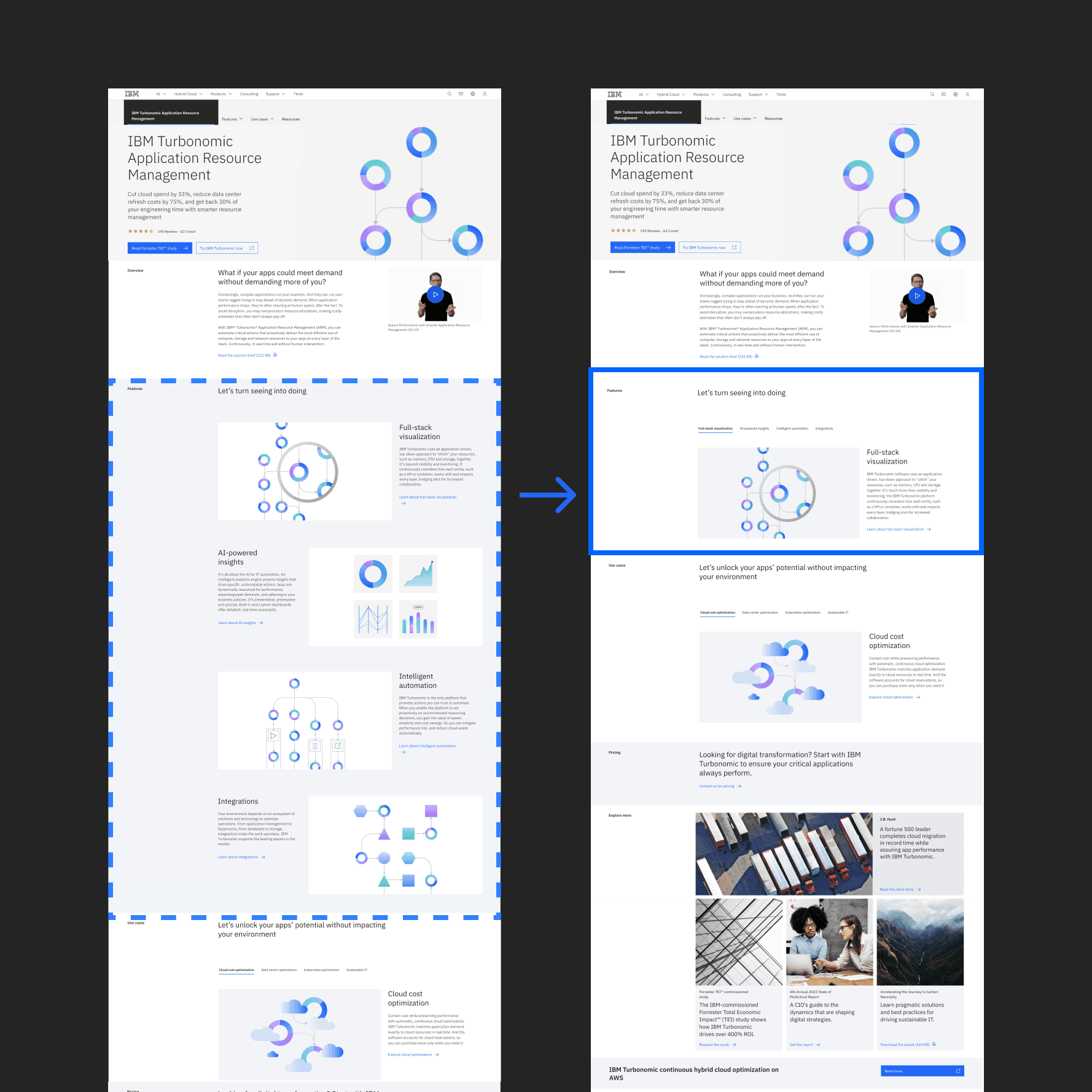 The Turbonomic acquisition presented a significant challenge for the Design team at IBM. Legacy sites needed migration into the IBM ecosystem while addressing critical UX gaps: poor product discoverability, siloed and repetitive content across pages, and incomplete information architecture compared to competitors. Competitive analysis revealed the site lacked dedicated navigation, comprehensive features documentation, and cohesive product storytelling—resulting in low engagement rates and minimal client interest.